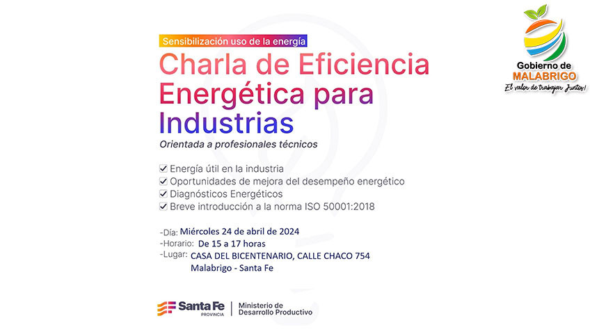 El Gobierno de Malabrigo hace extensiva la comunidad la invitación del Ministerion de Desarrollo Productivo, a prticipar de la charla "Eficiencia Energética para Industrias". La misma será dictada por la Subsecretaría de Energías Renovables y Eficiencia Energética de Santa Fe.