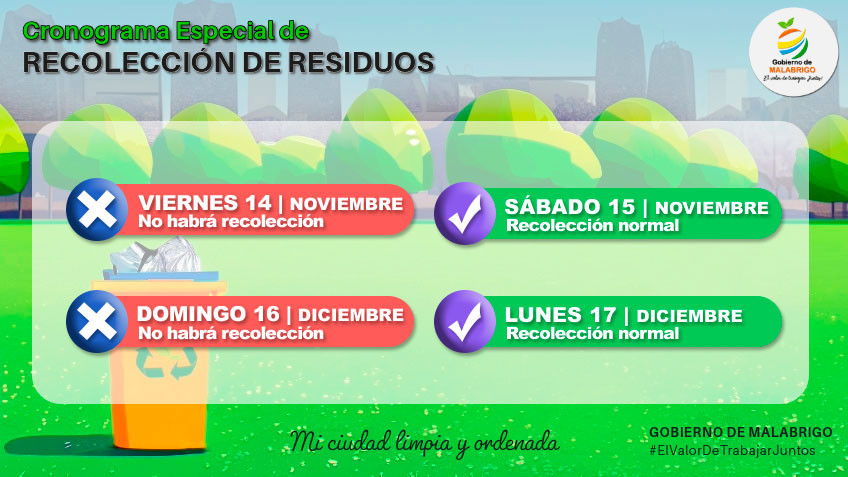 El día viernes 14 de noviembre no habrá recolección de residuos.